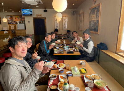 斜面で足場が大変・・・何度も滑り落ちたり、電動のこぎりの刃が断面に噛んで抜けなくなったりとトラブル続きでしたが、その後は苦労を共にした仲間たちとの至福のランチ、すべて疲れが吹き飛びました!